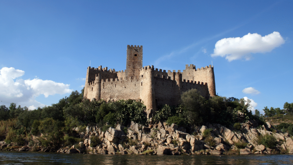 Bienvenue au Château d’Almourol, dressé sur un petit îlot rocheux au milieu du fleuve Tage, un lieu où l’histoire et la légende se confondent. Le site était occupé avant le Moyen Âge, probablement depuis l’époque romaine ou wisigothique, mais c’est au XIIe siècle que le château prend la forme que nous connaissons aujourd’hui.